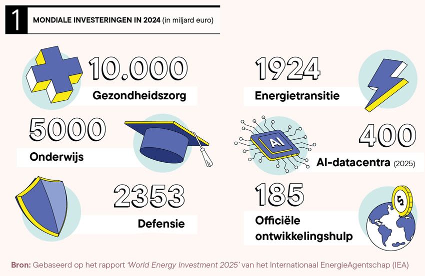 De voorbije jaren gingen de mondiale uitgaven voor defensie sterk de hoogte in. In 2024 stegen de wereldwijde defensie-uitgaven volgens het Stockholm Instituut voor Internationaal Vredesonderzoek (SIPRI) met meer dan 9% naar 2353 miljard euro. Dat is de sterkste stijging sinds 1988. In 2015 lagen de uitgaven nog onder de 1650 miljard euro, de voorbije tien jaar groeiden de defensiebudgetten dus met bijna 40%. In dezelfde periode verdubbelden de investeringen in de energietransitie haast van 1040 miljard euro tot de huidige 1924 miljard euro.