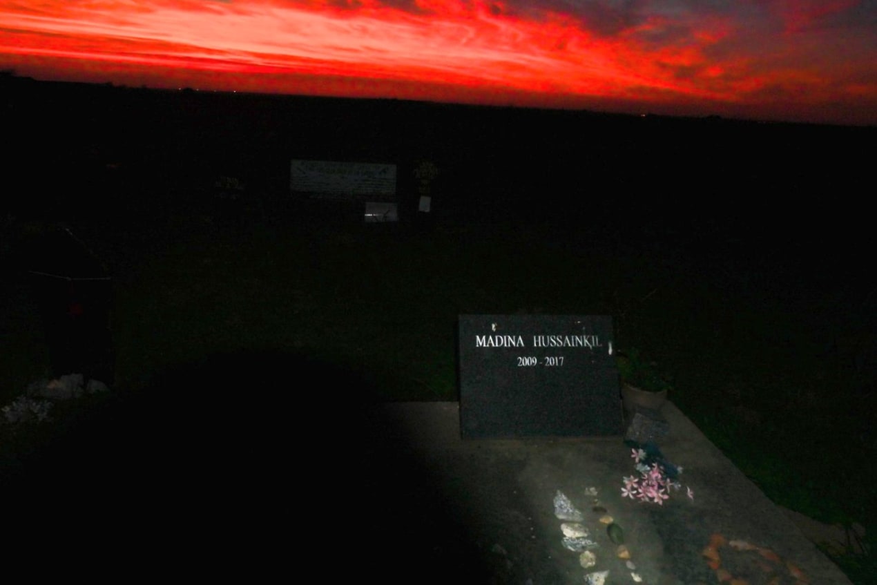 De grafsteen van de achtjarige meisje Madina Hussainkil, gegrepen door een trein na een pushback door de Koatische autoriteiten.