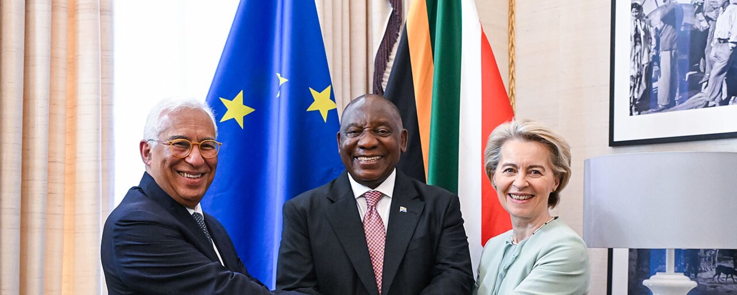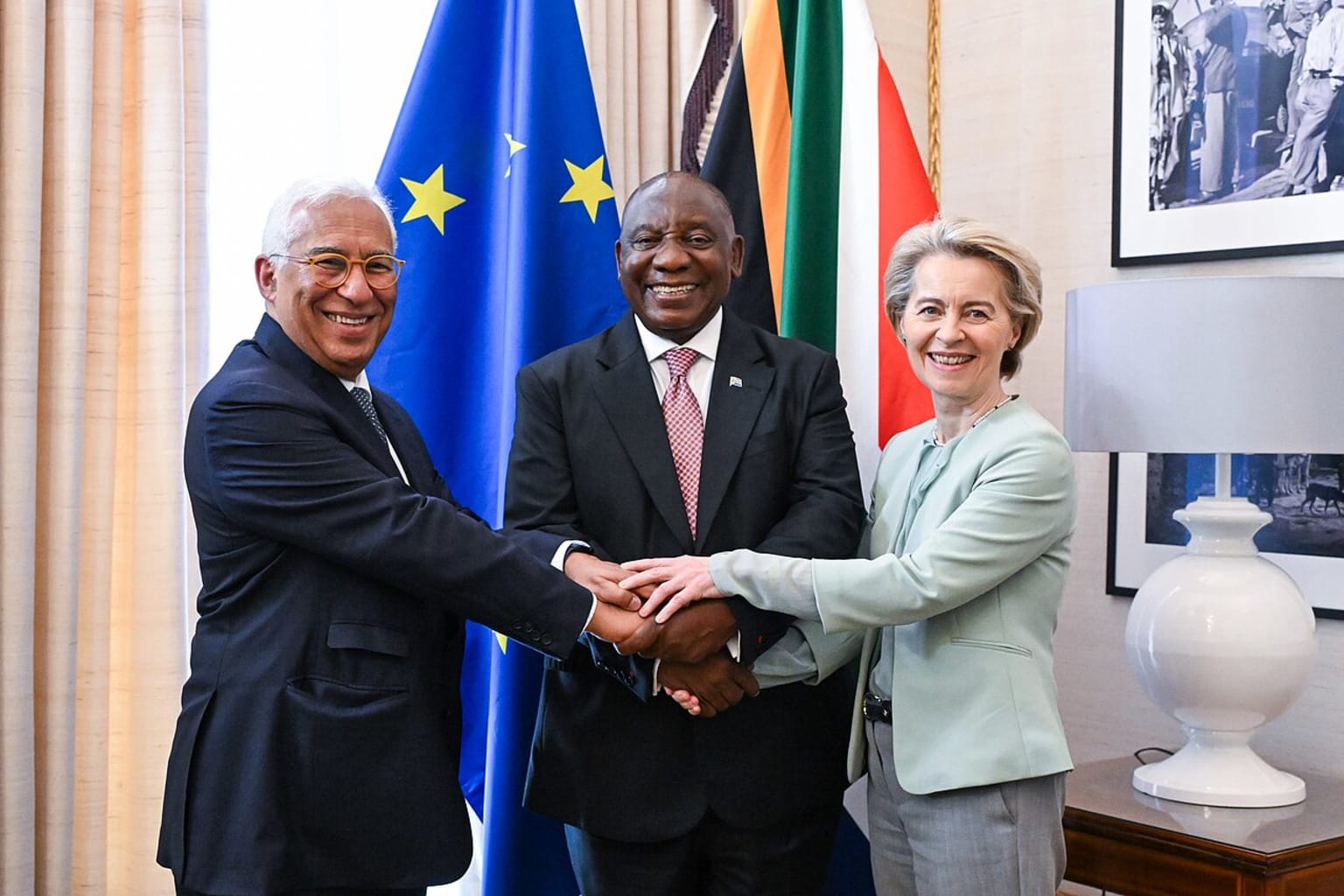 Vlnr: António Costa (voorzitter van de Europese Raad), Cyril Ramaphosa (pesident Zuid-Afrika) en Ursula von der Leyen (voorzitter Europese Commissie).