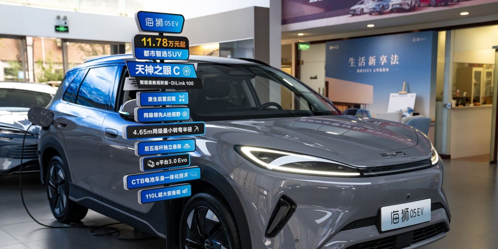 De glanzend blauwe luxewagen met sportieve lijnen moet de concurrentie aangaan met merken als Porsche en Mercedes-Benz. Het model bouwt verder aan BYD’s droom om naast Tesla ook andere gevestigde autofabrikanten uit te dagen en voorbij te steken.