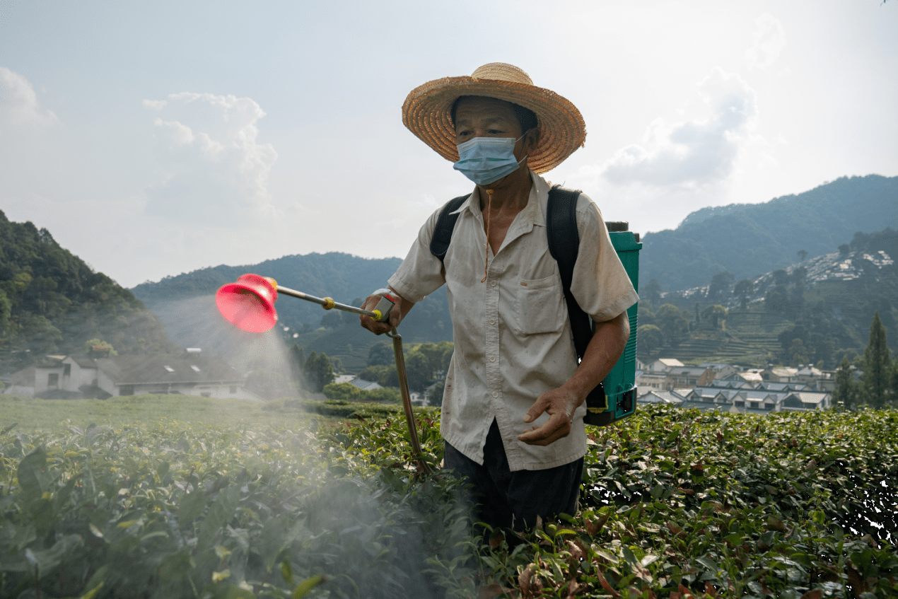 De 66-jarige Zhu Yuejin wandelt in zwarte slippers, een korte broek en een doorweekt T-shirt door zijn groene theevelden op zoek naar beschadigde planten. Daarvoor hoeft hij de berg niet ver op te lopen. ‘Kijk eens hoe al die theebladeren bruin zijn? Ze zijn verbrand door de hoge temperaturen’, zegt hij. Het is 41 graden Celsius en de zon brandt op zijn rug.