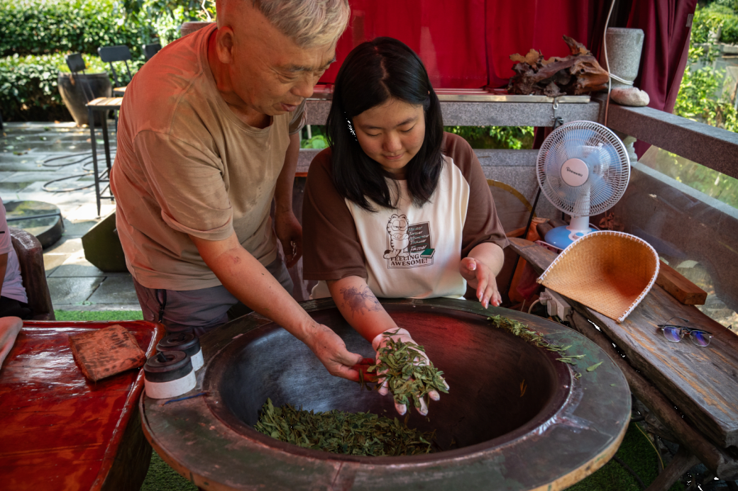 ‘Gebruik de volledige hand en druk voorzichtig op de theebladeren. Als die geluid maken zijn ze klaar’, zegt theeverbouwer Zhu tegen een groep toeristen. Zhu is een meester in het handmatig drogen van theebladeren. Door de opkomst van machines wordt deze techniek steeds minder beheerst, maar Zhu is er bijzonder bedreven in en heeft er zelfs een keer een wedstrijd mee gewonnen.