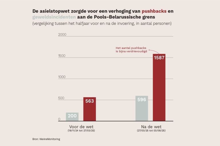 We Are Monitoring, het vrijwilligersnetwerk dat sinds 2021 pushbacks en geweld aan de grens documenteert, registreerde via hun noodlijn in een halfjaar tijd 1587 pushbacks – bijna drie keer zoveel als vóór de invoering van de wet. Ook het geweld nam fors toe: aan Poolse zijde steeg het aantal meldingen met ruim 185%, aan Belarussische zijde met ongeveer 210%.