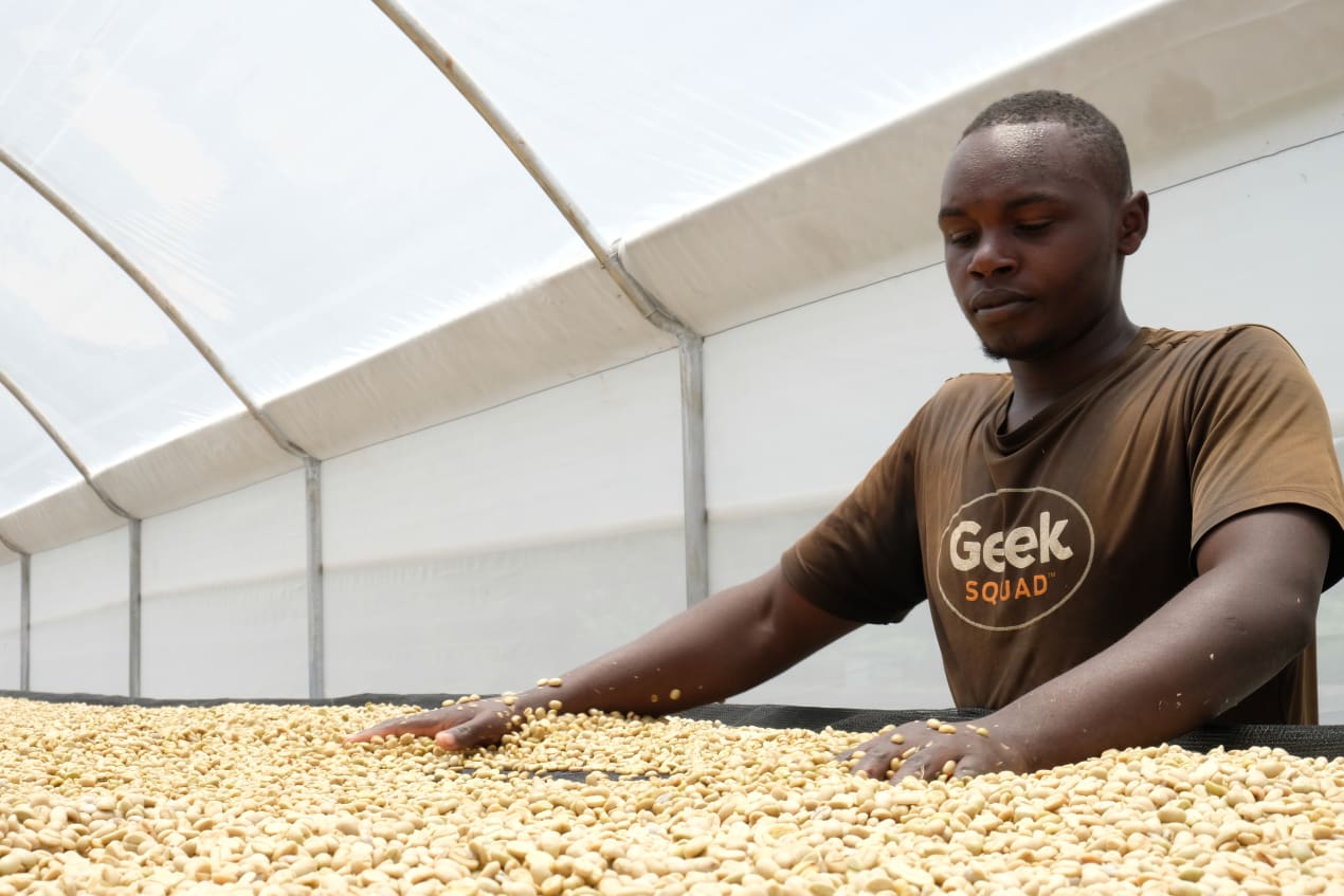 Bonen worden gedroogd en gewassen in een van de wasstations van Rung'eto.