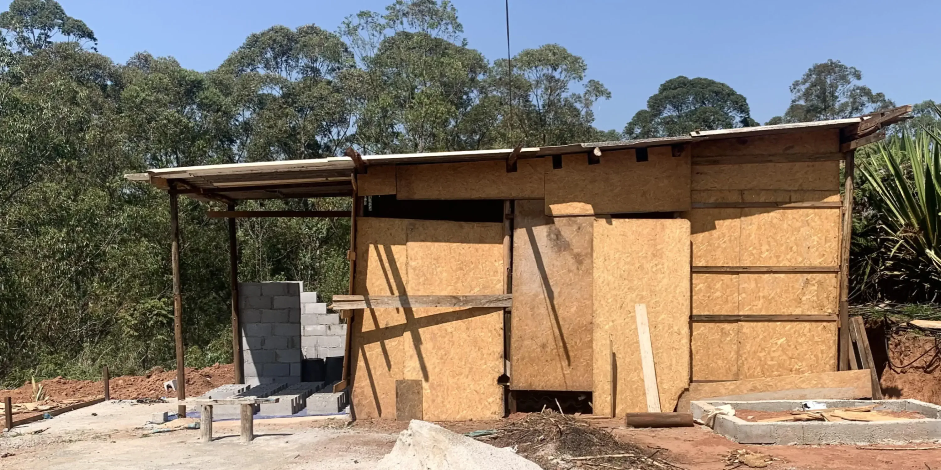 Een armoedig huisje in aanbouw in de enclave Comuna da Terra Irmã Alberta