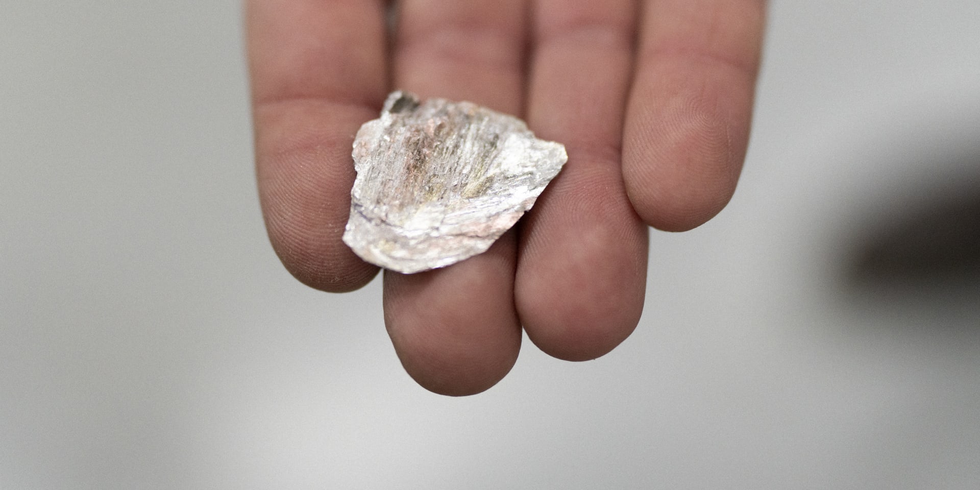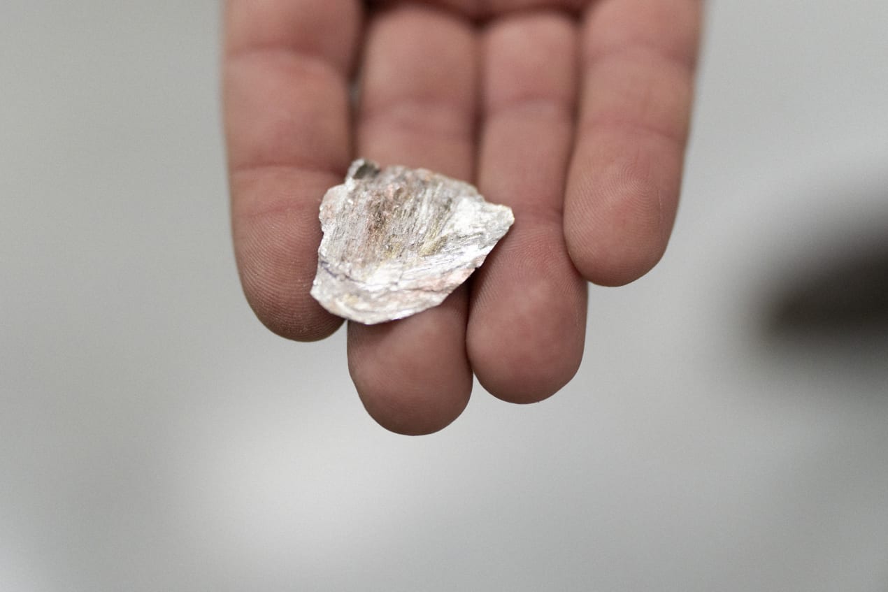 Geoloog Tomáš Vrbický toont mica, de mineralengroep dat lithium bevat.
