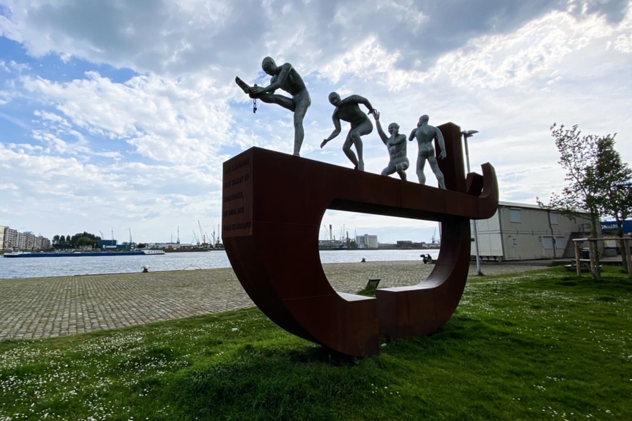 Op een honderdtal kilometer van Antwerpen ligt de grootste haven van Europa, Rotterdam. Op een grasveldje aan de oever van de Nieuwe Maas, waar de rivier zich afsplitst en naar het centrum van de stad vloeit, staat het stalen slavernijmonument van Rotterdam.