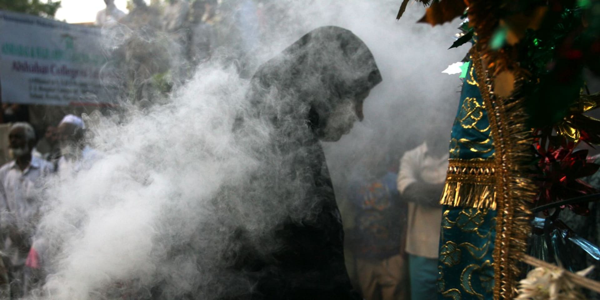 Een indiase moslimvrouw loopt langs brandende wierook tijdens een Muharram-processie ter gelegenheid van Ashura in Mumbai (januari 2009).